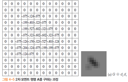 식 (4.6)에 들어있는 행렬 A는 해리스가 제안한 코너 검출 알고리즘에서 핵심적인 역할을 하므로 식(4.7)로 따로 써 보자. \(\textcolor{Black}{ A=\begin{pmatrix}G ∗ d_y^2&&G ∗ d_y d_x\\G ∗ d_y d_x&&G ∗ d_x^2 \end{pmatrix} \quad (4.7) }\) 행렬 A는 자가 공관계(auto-correlation) 행렬 또는 2차 모멘트 행렬(second moment matrix)이라 불린다.